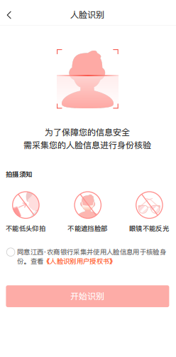 5)阅读、勾选用户授权书,点击“开始识别”并完成人脸识别,成功后即进入验证银行卡界面。
