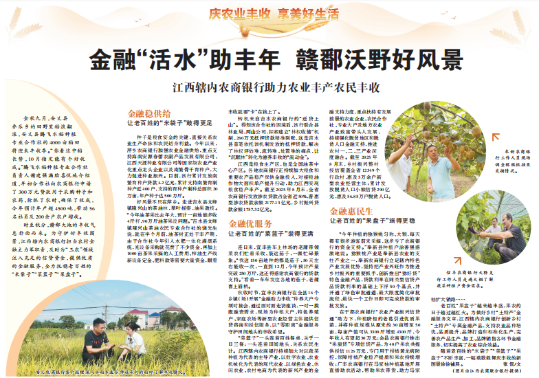 时至秋分,赣鄱大地的丰收气息扑面而来。为守护好丰收图景,江西辖内农商银行担当农村金融主力军职责,及时为“三农”领域注入充足的信贷资金,提供优质的金融服务,全力托稳老百姓的“米袋子”“菜篮子”“果盘子”。
