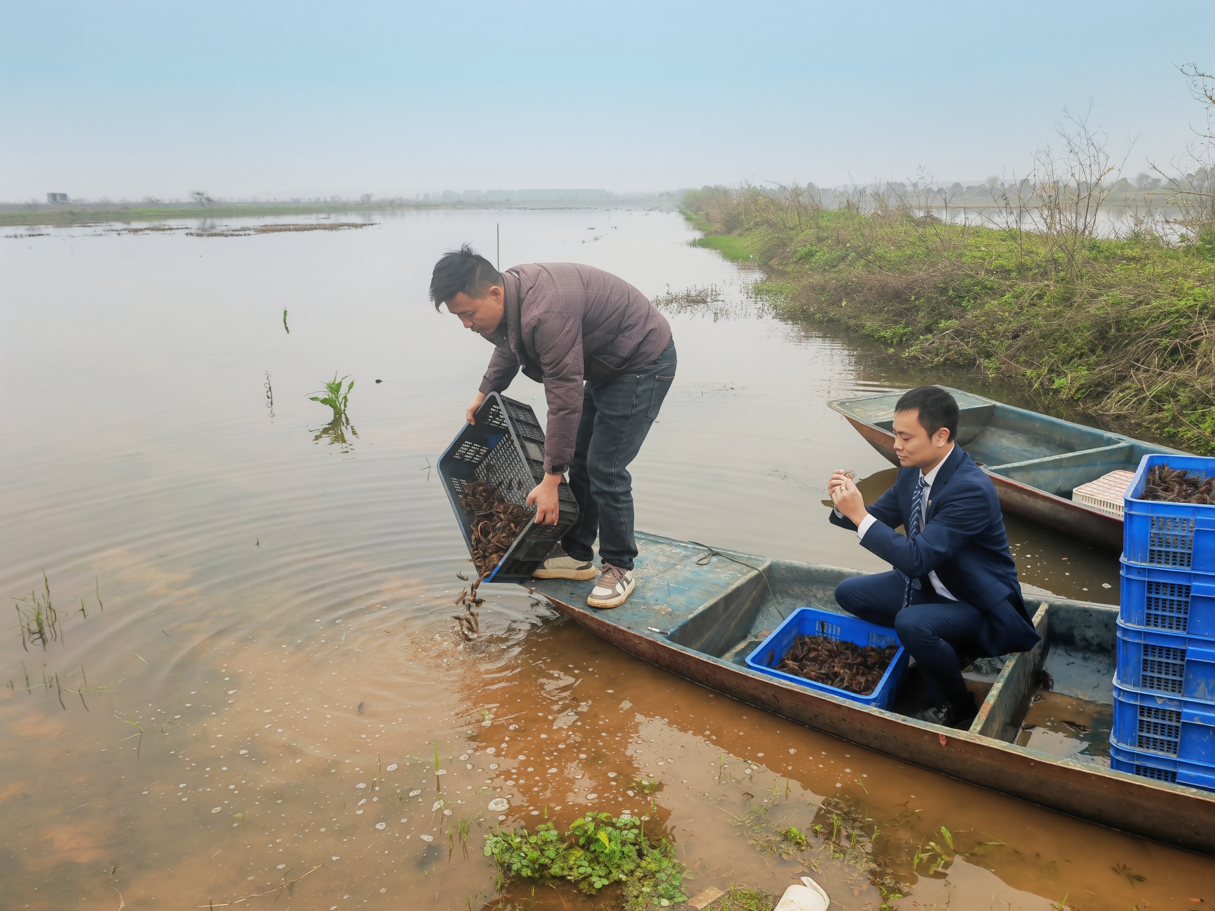 ▲吉水农商银行工作人员实地了解清水小龙虾养殖情况