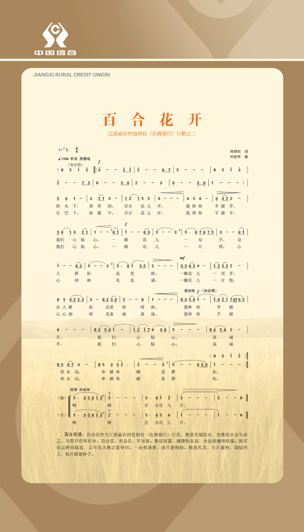 我们是中国信合光荣一员,神圣使命担当在肩。工作赋予生命价值,青春才华甘于奉献。将敬业和忠诚啊融入血液,信任与友谊地久天长。把勤奋和严谨啊铭刻心间,广阔天地让理想飞翔。我们的团队充满阳光,春风相伴,携手向前。我们的团队志在必得,风雨同舟,走向明天。走向明天。