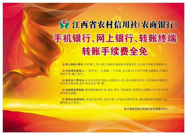 金秋十月、丹桂飘香,江西省农村信用社给您送福利了!自10月12日起,江西省农村信用社所有客户通过手机银行、网上银行、转账终端转账本地、异地、本行、跨行均享受0费率,这是我省首家实行网上转账全免费的银行。而且,客户首次办理网银U盾、IC百福卡免收工本费,免收银行卡年费、磁条卡非保号换IC卡手续费,免费多多,详询全省24小时咨询热线96268。