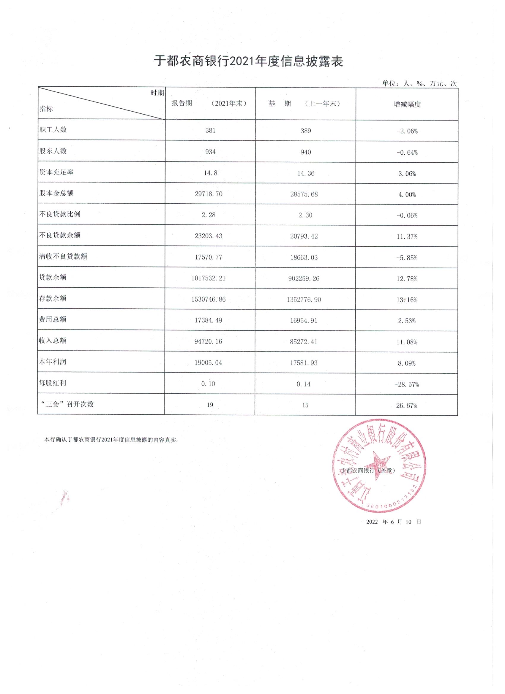 于都农商银行2021年度信息披露表